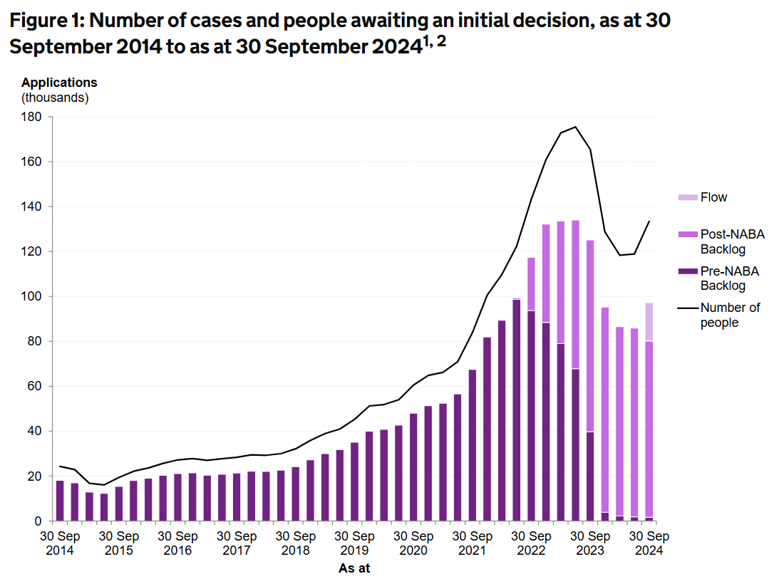The total number of cases awaiting a decision has increased slightly in the period July to September 2024 and is 13% higher than at the end of June. This is because most asylum claims were stuck in limbo as the previous government was refusing to process them. Since July, processing has restarted but in most cases interviews will take place before a decision can be made and that accounts for the increase.
